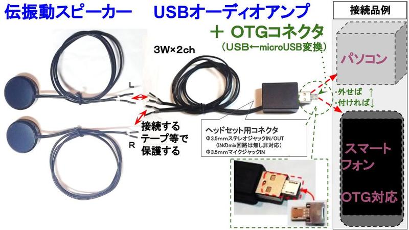 USBオーディオ付き収縮チューブタイプ」を使った「伝振動スピーカー」の接続例です。