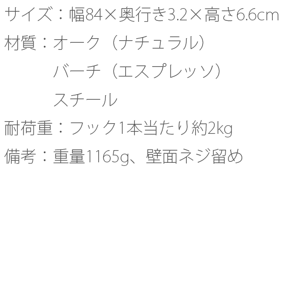 サイズ: 幅84×奥行き3.2×高さ6.6cm 材質: オーク(ナチュラル)、バーチ(エスプレッソ) スチール 耐荷重: フック1本当たり約2kg 備考: 重量1165g、壁面ネジ留め コンパクトタイプもご用意しております。