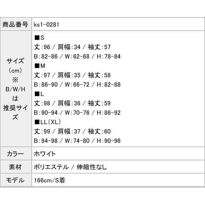 商品番号 ks1-0281 サイズ(cm)※B/W/Hは推奨サイズ ■S 丈:96 / 肩幅:34 / 袖丈:57 / B:82-86 / W:62-68 / H:78-84 ■M 丈:97 / 肩幅:35 / 袖丈:58 / B:86-90 / W:66-72 / H:82-88 ■L 丈:98 / 肩幅:36 / 袖丈:59 / B:90-94 / W:70-76 / H:86-92 ■LL(XL) 丈:99 / 肩幅:37 / 袖丈:60 / B:94-98 / W:74-80 / H:90-96 カラー ホワイト 素材 ポリエステル / 伸縮性なし モデル 166cm/S着 詳細 エレガントさとカジュアル要素の両方を感じさせるオシャレな存在感を放つ、長袖仕立てのショート丈ワンピースです。